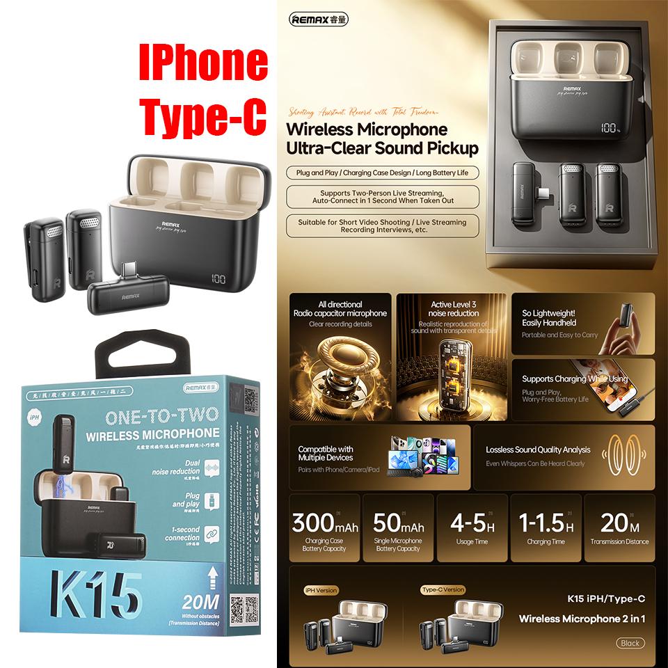 Microphone LIVE Wireless Remax K15 Type-C 2in1 - ក្បាលមេក្រូអត់ខ្សែ Remax K15 Type C 2in1