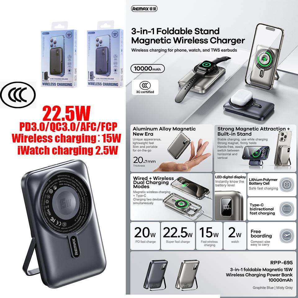 Power Bank wireless magnetic PD20W Remax RPP-695 3C 10000mAh - ថ្មជំនួយ សាកលឿនឥតខ្សែ ម៉ាញេទិក Remax RPP-695 CCC 10000មីលីអំពែ